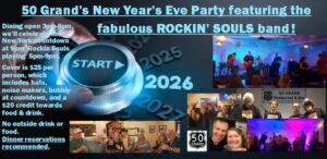 Music 5pm-9pm with the New York New Years Eve countdown at 9pm. First come first serve, no reservations for the Rockin’ Souls band in our event room and bar. $25 cover charge per person, which includes hats, noise makers, bubbly at countdown, and a $20 credit towards food & drink. Event room will have simple bar food available.